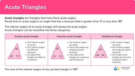 Understanding these different types of triangles helps you quickly identify and classify them based on their angles. Knowing whether a triangle is acute, right, or obtuse can be very useful in solving geometry problems.