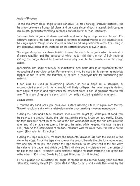 • The Fixed Cone Method: This is one of the simplest methods. You slowly pour the granular material onto a flat surface until a cone forms. You then measure the height of the cone and the radius of its base. Using these measurements, you can calculate the angle of repose using basic trigonometry. The formula is: angle of repose = arctan(height / radius). This method is easy to set up and can be done with a ruler, protractor, and a little bit of math.
