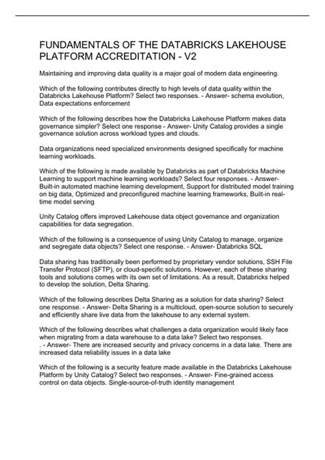 Let’s get to the nitty-gritty. Here are some of the most common questions you’ll encounter during your preparation for the Databricks Lakehouse Platform Accreditation V2, with straightforward answers. These are designed to help you prepare effectively and build your confidence before the exam. These questions and answers are based on the latest exam content and cover various areas, from architecture to data management. Preparing for these questions can boost your confidence and help you perform better on the actual exam. Make sure you practice answering these questions in a clear and concise manner, to reflect your understanding. Remember, the goal is not just to memorize the answers but to grasp the concepts and apply them practically. Use these questions as a foundation to expand your knowledge and delve deeper into the platform. Good luck with the exam!