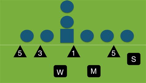 Next, the Technique numbers . These numbers are used to designate where the defensive lineman will line up against the offensive lineman. For instance, a “0-technique” means the DT is lined up directly over the center, a “1-technique” is lined up on the outside shoulder of the center, a “2-technique” is lined up on the outside shoulder of the offensive guard, a “3-technique” is lined up on the inside shoulder of the offensive guard, a “4-technique” is lined up on the outside shoulder of the offensive tackle, and so on. These techniques are vital in identifying how the defensive line is trying to attack the offensive line and set up the defensive plays.