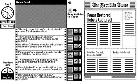The Republia Times is more than just a game; it’s an interactive commentary on media, control, and propaganda. Developed by Lucas Pope, the creator of Papers, Please , this game puts you in the shoes of a newspaper editor in a dystopian state. Your job is simple: edit the news to keep the government happy and your family fed. Sounds easy, right? Not so fast. The choices you make have real consequences, impacting not only your virtual family but also the wider political landscape of Republia. The game cleverly uses minimalist design and simple mechanics to deliver a powerful message about the responsibilities and ethical dilemmas faced by journalists and media professionals in authoritarian regimes. Through a series of daily editorial decisions, players are confronted with the challenge of balancing personal survival against the principles of truth and freedom of the press. Each day presents new articles, photographs, and directives from the government, forcing you to decide which stories to highlight, which to bury, and how to frame the news to maintain public support for the ruling party. As you navigate these complex choices, you’ll quickly realize that every decision has a ripple effect, influencing public opinion, political stability, and even the well-being of your own family. The game’s stark presentation and challenging moral choices create a compelling and immersive experience that stays with you long after you’ve finished playing. It’s a brilliant example of how video games can be used to explore serious social and political issues, prompting players to reflect on the power of media and the importance of critical thinking.