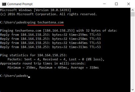 ping [destination]and press Enter. Replace[destination]with the IP address or domain name of the host you want to test. -