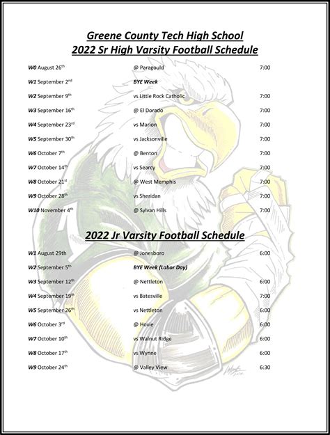 Alright, football fans, let’s talk about the schedule! Knowing when and where the Greene County Tech Football team plays is crucial for any fan. So, we’re going to break down the schedule, highlighting the key games, dates, and matchups. It’s time to mark your calendars. You don’t want to miss a single moment of the Golden Eagles’ action! The schedule is jam-packed with exciting games. These games test the team’s skills, determination, and teamwork. Each game is an opportunity to show their talent and passion for the sport. The season is a journey of highs and lows. It is filled with unforgettable moments. The schedule gives the fans the opportunity to support the Golden Eagles and experience the thrill of high school football. Get ready to cheer on the team, show your support, and make memories that will last a lifetime. The schedule also provides a sneak peek into the season’s challenges and exciting matchups.
