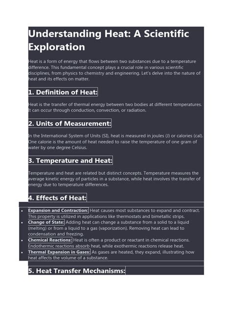 Mathematical Models: Some heat PDFs may include equations that describe the thermal behavior of the system being analyzed. These models can be used to predict temperature distributions under different conditions or to optimize the design of thermal systems. Understanding the assumptions and limitations of these models is essential for accurate interpretation.