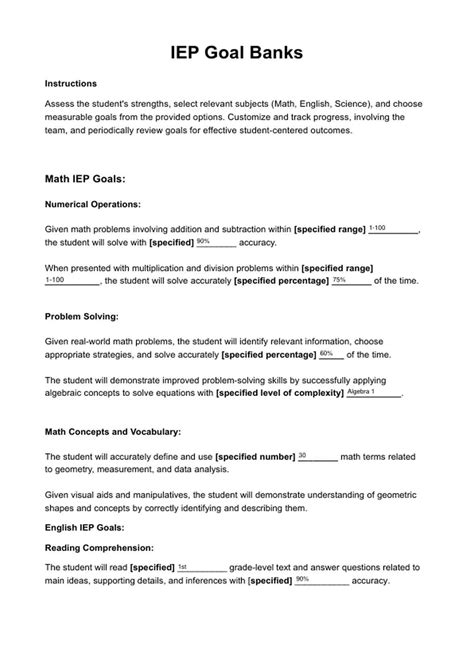 Hey guys! Let’s dive deep into the world of IEP Goals Bank PDF today. If you’re a parent, educator, or anyone involved in a child’s Individualized Education Program (IEP), you know how crucial it is to have well-defined, achievable goals. Finding the right resources can sometimes feel like searching for a needle in a haystack, right? Well, that’s where an IEP Goals Bank PDF comes in handy. Think of it as your secret weapon, a treasure trove of pre-written, adaptable goals that can save you heaps of time and effort. We’re talking about goals that cover a wide spectrum of developmental and academic areas, from communication and social skills to math and reading. The beauty of a goals bank is its flexibility. While it provides a solid foundation, you’re always encouraged to tailor these goals to the unique needs of each individual student. We’ll explore how these PDFs can be an invaluable tool in crafting effective IEPs, ensuring every child gets the support they need to thrive. So, buckle up as we unpack what makes a great IEP goals bank, where to find them, and how to best utilize them to make a real difference. It’s all about empowering you with the knowledge and resources to champion the educational journey of every child.