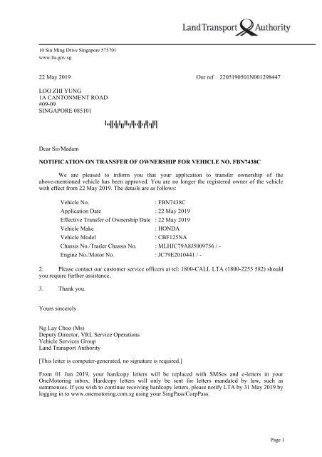 Another key piece of information is the vehicle’s make and model . This helps to ensure that the correct vehicle is being transferred and that there are no discrepancies. The notification may also include details about the vehicle’s engine capacity and chassis number . These are additional identifiers that can be used to verify the vehicle’s identity. In some cases, the notification might also mention any outstanding fees or charges associated with the vehicle, such as unpaid road tax or fines. This is important for the new owner to be aware of, as they will typically be responsible for these charges after the transfer. The notification will also provide information on how to contact the LTA if you have any questions or need further clarification. This could include a phone number, email address, or website. Finally, the notification will usually include a reference number or transaction ID. This can be used to track the transfer process and to refer to the specific transaction when communicating with the LTA. It’s a good idea to keep this notification in a safe place, as it serves as official proof of the ownership transfer. You might need it for insurance purposes, future transactions, or any other situations where you need to verify the ownership of the vehicle. So, in summary, the LTA ownership transfer notification is a comprehensive document that provides all the essential details about the transfer. Make sure to read it carefully and keep it for your records.