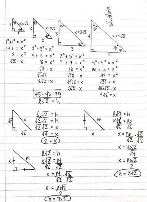 Alright, guys, let’s talk about the most important part: the side lengths of a 45-45-90 triangle . This is where the magic happens, and it all boils down to a simple ratio. If we call the length of each of the equal legs ‘x’, then the hypotenuse (the longest side, opposite the 90-degree angle) is always x√2 . That’s right, just ‘x’ times the square root of 2! So, the sides are in the ratio x : x : x√2 . This is the golden rule, the mantra you need to remember for 45-45-90 triangles. Let’s break it down. If you know one leg, say it’s 5 units long, then the other leg is also 5 units long. The hypotenuse would be 5√2 units long. If you were given the hypotenuse, say it was 10√2 units long, you could easily figure out that each leg must be 10 units long. You just divide the hypotenuse by √2. It’s that simple! Why √2? This comes directly from the Pythagorean theorem (a² + b² = c²). Since the legs are equal (let’s call them ‘x’), we have x² + x² = c². This simplifies to 2x² = c². Taking the square root of both sides gives us √(2x²) = √c², which means x√2 = c. Boom! There’s your hypotenuse. This relationship isn’t just a random fact; it’s a fundamental property derived from basic geometry. Understanding this ratio allows you to quickly find any missing side length without resorting to trigonometry (like sine, cosine, or tangent) or complex algebraic equations every single time. It’s a shortcut, a cheat code for geometry problems. So, commit this to memory: legs are x, hypotenuse is x√2 . Practice identifying these triangles and applying the ratio, and you’ll be solving problems like a pro in no time. This core concept is the foundation for many more advanced geometry and trigonometry applications, so mastering it now will pay huge dividends later on.
