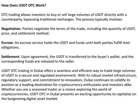 Let’s break down the process of engaging in OTC USDT trading in Indonesia. First things first, you’ll need to find a reputable OTC desk or broker. This is crucial , guys! Not all OTC providers are created equal. Look for entities that are well-established, have a strong track record, and are transparent about their fees and operations. Many traditional financial institutions are now offering OTC crypto services, alongside specialized crypto brokers. Once you’ve identified a potential partner, you’ll likely go through a Know Your Customer (KYC) and Anti-Money Laundering (AML) process. This is standard practice and ensures compliance with financial regulations. After verification, you’ll communicate your trading needs – how much USDT you want to buy or sell, and your target price range. The OTC desk will then work to find a matching counterparty. If a match is found, you’ll agree on the final price and terms. The actual settlement usually happens quickly, with the USDT and your fiat currency (like Indonesian Rupiah, IDR) being exchanged directly between the parties involved, facilitated by the OTC desk. This streamlined process is what makes OTC trading so attractive for large transactions. It bypasses the complexities and potential volatility of public order books, offering a more controlled trading environment. Remember, due diligence in choosing your OTC partner is paramount to a secure and successful trading experience in the Indonesian crypto market.