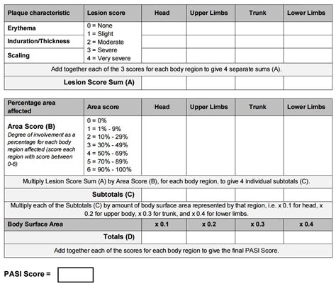 Keep in mind, these are just general guidelines. Your doctor will consider your individual situation, medical history, and how the psoriasis impacts your life when making treatment decisions. The PASI score helps dermatologists determine the severity of psoriasis. The PASI score helps in determining how severe your psoriasis is. The PASI score is crucial in determining the severity of your psoriasis. The PASI score is a tool for dermatologists to determine how severe your psoriasis is. The PASI score helps determine the best course of action. The PASI score provides a framework for understanding the severity of psoriasis. The PASI score can help your doctor determine what treatment plan would be best. The higher the PASI score, the more severe the psoriasis. The PASI score helps measure the severity of the skin disease. The PASI score is an indication of the extent and severity of the disease. The PASI score helps to provide a consistent measure. The PASI score is used to determine the severity of psoriasis. The PASI score is a tool that helps measure the severity of psoriasis.