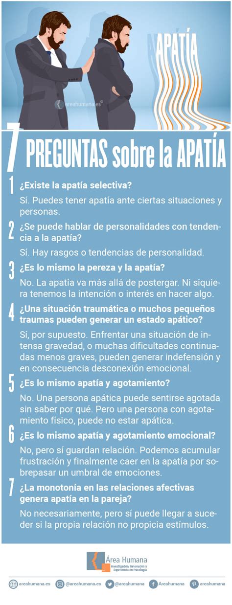 Chicos, sé que lo hemos mencionado, pero es súper importante que sepamos distinguir entre apatía y depresión. Entender la diferencia entre apatía y depresión es clave porque, aunque comparten algunos síntomas, sus causas y tratamientos pueden ser muy distintos. La depresión es un trastorno del estado de ánimo complejo que se caracteriza principalmente por una tristeza persistente y una pérdida de interés o placer en casi todas las actividades. Piensa en ello como un estado de ánimo bajo constante, acompañado de sentimientos de desesperanza, culpa e inutilidad. La persona deprimida suele experimentar también cambios significativos en el apetito y el sueño (comer o dormir mucho más o mucho menos), fatiga extrema, dificultad para concentrarse y, en casos graves, pensamientos suicidas. La apatía, por otro lado, es más bien una falta de sentimiento o emoción . Es una indiferencia generalizada. Una persona apática puede no sentirse triste per se, pero tampoco se siente feliz, entusiasmada o motivada. Es como si las emociones estuvieran en stand-by . Mientras que la depresión implica una profunda sensación de malestar emocional, la apatía es más una ausencia de emoción, una desconexión. Alguien con depresión a menudo desea sentirse mejor y tener interés, pero se siente incapaz de lograrlo debido a la intensidad de su malestar. Alguien apático simplemente no siente la necesidad de sentir o de interesarse, o le resulta imposible movilizarse para ello. Es una sutil pero vital diferencia. Imagina que la depresión es un grito de ayuda ahogado en tristeza, y la apatía es un silencio profundo y vacío. Otra distinción importante es la presencia de anhedonia en la depresión. La anhedonia es la incapacidad para experimentar placer. En la depresión, la persona pierde el placer en cosas que antes disfrutaba. En la apatía, puede que no haya una pérdida activa de placer, sino más bien una falta general de respuesta o interés ante cualquier estímulo, sea placentero o no. A veces, la apatía puede ser un síntoma de la depresión, pero también puede existir de forma independiente o ser producto de otras condiciones (médicas, neurológicas, etc.). Por eso, si sospechas que puedes estar experimentando alguno de estos estados, lo más recomendable es consultar con un profesional de la salud . Ellos podrán hacer una evaluación adecuada y guiarte hacia el camino correcto, ya sea terapia, medicación o cambios en el estilo de vida. ¡No te quedes con la duda, tu bienestar es lo primero!