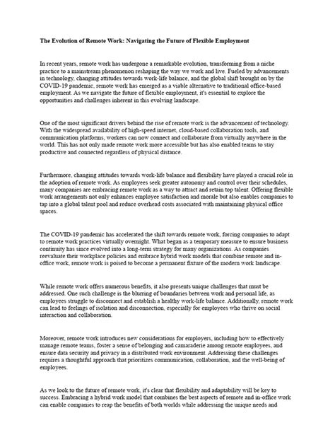 Remote Work: Navigating the Future of Flexible Employment\n\nHey there, guys! Let’s talk about something that’s totally changed the game for how we work: remote work . Seriously, the way we’ve adapted to working from anywhere has been nothing short of a revolution, and it’s clear this isn’t just a temporary trend. This article is all about diving deep into the evolving landscape of remote work , exploring everything from its incredible benefits to the tricky challenges we’ve all faced, and looking ahead at what the future holds for this flexible employment model. We’re going to break down how businesses and individuals alike are thriving in this new era, and how we can all make the most of the opportunities it presents. It’s not just about working from home; it’s about a fundamental shift in how we view productivity, work-life balance, and even company culture. So, buckle up, because we’re about to explore the ins and outs of this fascinating topic, and trust me, you’ll want to stay updated on this because it impacts everyone in the professional world. We’ll be talking about key strategies, essential tools, and the mindset shift needed to truly succeed in this dynamic environment. Get ready to rethink everything you thought you knew about work, because the future is already here, and it’s incredibly flexible.\n\n## The Rise of Remote Work: A Paradigm Shift\n\n The rise of remote work has fundamentally reshaped the global employment landscape, guys, marking a true paradigm shift that few could have fully predicted just a few years ago. What started as a niche option for a select few or a necessity during unprecedented times, has quickly evolved into a mainstream, highly desired, and often preferred mode of operation for countless organizations and professionals worldwide. Seriously, it’s not just a fad; it’s a permanent change in how we view employment, productivity, and geographical limitations. Before this monumental shift, the traditional office model reigned supreme, with daily commutes, fixed workstations, and in-person meetings being the norm. The idea of employees successfully collaborating and innovating from different cities, or even continents, often seemed like a distant, futuristic concept. However, advancements in digital communication technologies, cloud computing, and project management software laid the groundwork, creating a robust infrastructure that made the transition to remote work smoother than many initially expected. This technological backbone has proven that physical proximity isn’t always a prerequisite for effective teamwork or business success. In fact, many companies have reported increased productivity and employee satisfaction when embracing a remote-first or hybrid approach. We’ve seen a massive surge in companies adopting policies that support working from anywhere, recognizing the immense value it brings to both their bottom line and their talent retention efforts. This paradigm shift also forced a crucial reevaluation of traditional management styles, moving away from micromanagement and towards a trust-based, results-oriented approach. Leaders had to learn to empower their teams, provide clear objectives, and focus on outcomes rather than hours spent at a desk. The cultural implications are huge, allowing for greater diversity and inclusion as companies can now tap into a global talent pool, unconstrained by location. This opening up of opportunities has been a game-changer for individuals seeking roles that fit their lifestyle, as well as for businesses striving to find the best talent regardless of where they reside. The economic benefits are also undeniable, with reduced overhead costs for office space and utilities for businesses, and savings on commuting and professional attire for employees. This profound transformation isn’t just about changing where we work; it’s about altering how we work, interact, and envision our professional lives. It’s a continuous evolution, and understanding its roots and rapid growth is key to navigating the future effectively, guys. This shift has also highlighted the importance of digital literacy and adaptability for all professionals, pushing us to constantly learn and evolve alongside the technologies that enable this new way of working. It’s an exciting time to be in the workforce, witnessing and participating in such a significant evolution.\n\n## Key Benefits of Embracing Remote Work\n\nEmbracing remote work brings a plethora of key benefits for both employees and employers, making it a truly attractive model for the modern workforce. For starters, let’s talk about the incredible flexibility it offers. Guys, imagine ditching that dreadful daily commute! This isn’t just about saving time; it’s about reclaiming hours that can be spent with family, on personal hobbies, or simply getting more sleep. This enhanced work-life balance is a massive win for employee well-being, leading to reduced stress and burnout. When people feel more in control of their schedules and environment, they’re generally happier and more engaged, which translates directly into better performance and job satisfaction. Seriously, a happy employee is a productive employee, and remote work often fosters this happiness by allowing individuals to structure their day in a way that suits their personal rhythm. Beyond flexibility, access to a global talent pool is another colossal advantage for businesses. No longer are companies restricted to hiring individuals living within a commutable distance from their physical office. This freedom opens up opportunities to recruit the absolute best talent from anywhere in the world, leading to more diverse teams, richer perspectives, and ultimately, stronger innovation. Think about it: you can find the perfect expert for a specialized role, regardless of their geographical location, which significantly boosts your competitive edge. For employees, this means mo
