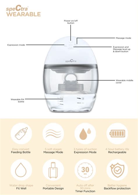 • Multiple Modes and Suction Levels: The Spectra Wearable Pump is often designed with various modes and suction levels to cater to individual needs and preferences. This allows you to customize your pumping session for comfort and efficiency. It usually includes massage and expression modes.