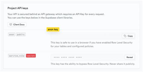 Now, let’s talk about the Anon Key . This is also known as the public API key. This key is your project’s secret weapon ! It’s super important to understand how it works. The Anon Key is a special key that allows unauthenticated access to your Supabase project. What does this mean, you ask? Well, it’s used for actions that don’t require a user to be logged in. Think of it as a gate pass for your app. It provides access to certain features and data without requiring a user to authenticate. For instance, if you have a public blog post, a user does not need to log in to read it. The Anon Key is the key that enables this. So, it’s like a public key that allows access to publicly available information and functions within your Supabase project. This key is specifically designed for use in your client-side applications (like your frontend code). You’ll typically use it to initialize your Supabase client and perform operations that don’t require user authentication, such as fetching public data or allowing a new user to sign up. It’s super crucial for security. Since it’s meant for public use, you should treat it as such; however, do not expose your service role key in your client-side code. If your service role key is compromised, someone could potentially access all your data and perform actions without any restrictions. This Anon Key enables your application to interact with your Supabase backend for read-only actions and other non-authenticated operations. The Anon Key grants permission to read the data, but it does not provide any admin-level control. This is the whole purpose of the key; allowing safe read-only access. When you’re dealing with sensitive data or user-specific actions (like updating a user’s profile), you should always use the user’s authentication tokens. The Anon Key is like a key to the front door, while the user’s authentication tokens are keys to the rest of the house. In short, the Anon Key is the key for allowing unauthenticated access to your Supabase project, enabling your applications to interact with public data without the need for a user to log in. Always be sure to keep the key safe, and only share it in your client-side code.