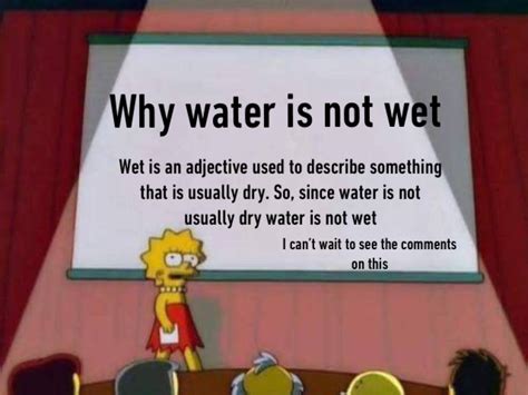 Q4: Is water actually wet from a scientific perspective? A4: Scientifically, water itself isn’t wet; it makes things wet. Wetness describes the ability of a liquid to adhere to a surface due to adhesive and cohesive forces. So, while the meme is about stating the obvious, there’s a scientific nuance to the concept of wetness.