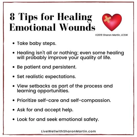 Alright, let’s get down to the good stuff: the healing process! It’s important to remember that healing isn’t a linear journey. There will be ups and downs, good days and bad days, but with the right tools and a little bit of perseverance, you can find relief. The first crucial step is self-awareness . This is all about paying attention to your thoughts, feelings, and behaviors. Keep a journal to track your moods, identify triggers, and notice patterns. The more you understand yourself, the better equipped you’ll be to manage your emotional wounds. Next up is therapy . Therapy provides a safe space to explore your experiences, process your emotions, and develop healthy coping mechanisms. A therapist can help you identify the root causes of your wounds and guide you through the healing process. Cognitive Behavioral Therapy (CBT) and Dialectical Behavior Therapy (DBT) are two therapeutic approaches often used to treat emotional wounds. Then, consider mindfulness and meditation . These practices can help you become more aware of your thoughts and feelings without judgment. They can also help you reduce stress and cultivate a sense of calm. Meditation can be as simple as taking a few minutes each day to focus on your breath. Another tip is to practice self-compassion . Treat yourself with the same kindness and understanding you would offer a friend. Remind yourself that you’re human, you’re not perfect, and it’s okay to make mistakes. Self-compassion can help you to accept your flaws and forgive yourself for past hurts. It is also important to set healthy boundaries . Learn to say no to things that drain you emotionally and protect yourself from toxic relationships. Boundaries are essential for protecting your emotional well-being and preventing further harm. Connect with supportive people . Surround yourself with people who love and support you. Share your feelings with trusted friends, family members, or support groups. Social support can provide comfort, validation, and a sense of belonging. Finally, make sure that you take care of your physical health . Regular exercise, a balanced diet, and sufficient sleep can all help to boost your mood and resilience. Physical health is closely linked to emotional well-being, so prioritize these things as part of your healing journey. There are so many ways to heal, and you can definitely find a path that works for you. Remember, healing is a journey, not a destination. Be patient with yourself, celebrate your progress, and don’t be afraid to seek help when you need it.