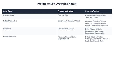 So, let’s break down the different kinds of bad actors you might encounter in the cybersecurity realm. It’s not just one monolithic group; they come in all shapes and sizes, each with their own unique motivations and methods. First up, we have the financially motivated cybercriminals . These are your classic thieves, but instead of robbing banks, they’re after your data, your money, or anything they can sell on the dark web. Think ransomware attacks that lock up your files and demand payment, or phishing scams designed to steal your login credentials and financial information. They are often highly organized and operate like businesses, constantly refining their techniques to maximize profit. Then there are the nation-state actors . These guys are usually backed by governments and are often involved in espionage, intellectual property theft, or even cyber warfare. Their goals can be strategic, aiming to destabilize rival nations, gain military advantages, or steal sensitive government information. They often have significant resources and can carry out highly sophisticated and targeted attacks. Hacktivists are another interesting bunch. They use their hacking skills to promote a political or social agenda. While their intentions might seem noble to some, their methods often involve illegal intrusions, data leaks, and denial-of-service attacks, causing significant disruption. They want to make a statement and bring attention to their cause, often by targeting organizations they disagree with. We also can’t forget the insider threats . These are individuals who already have legitimate access to an organization’s systems, like disgruntled employees, careless staff, or even compromised accounts. Their access makes them particularly dangerous because they can bypass many external security measures. Finally, there are the script kiddies , who are often less sophisticated but can still cause damage. They typically use pre-made tools and scripts created by others to launch attacks, often for notoriety or just to cause chaos. Recognizing these different types is key because the way you defend against a state-sponsored espionage group will be very different from how you’d protect against a phishing scam targeting individuals. Each requires a tailored approach to security.