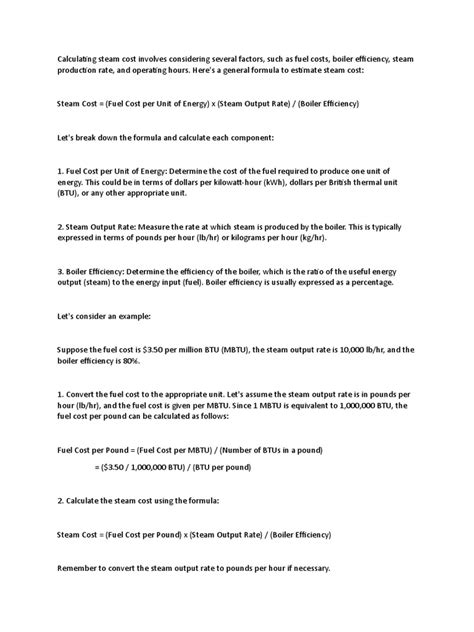 - Determine the Price of Steam: This is the total cost of producing steam over a specific period, such as a month or a year. Gather all the relevant costs, which includes fuel expenses, labor costs, water treatment costs, and any other expenses directly related to steam production. You’ll need to sum all these costs.